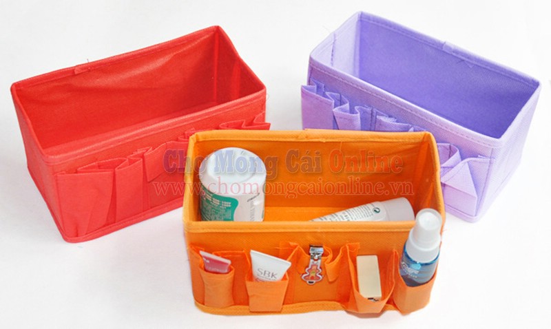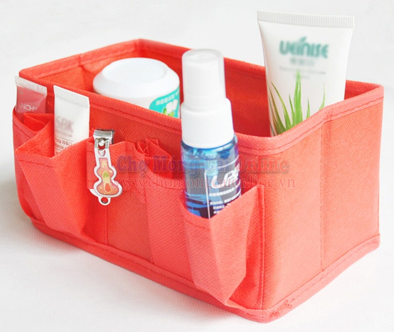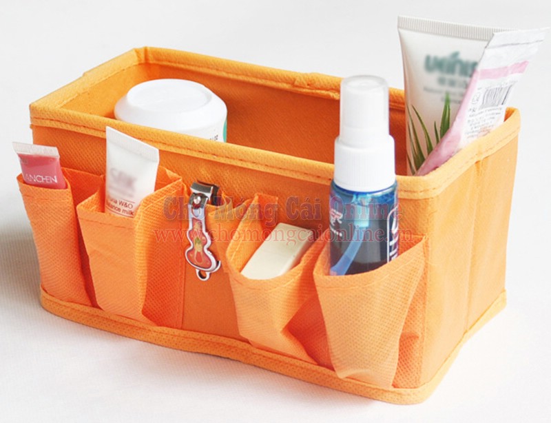 Hộp đựng đồ trang điểm với thiết kế thông minh gồm một ngăn lớn và nhiều ngăn nhỏ, dùng để đựng các loại mĩ phẩm dạng tuýp, chai, lọ lớn, những ngăn nhỏ bên hông có thể đựng những loại nhỏ hơn hay những vật dụng khác như cọ trang điểm, dụng cụ bấm móng,...