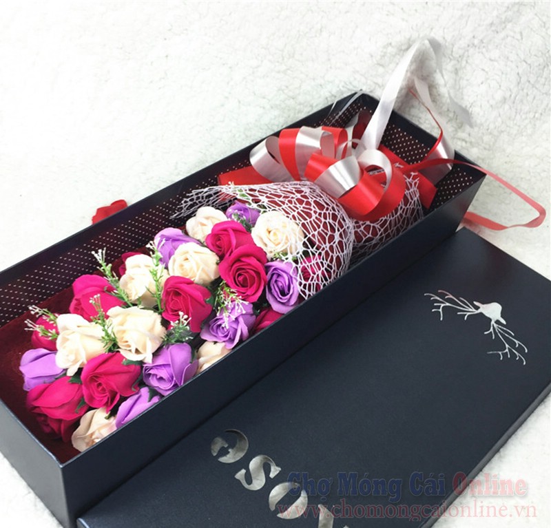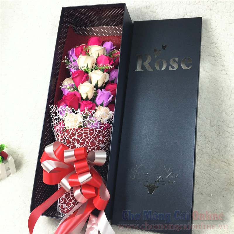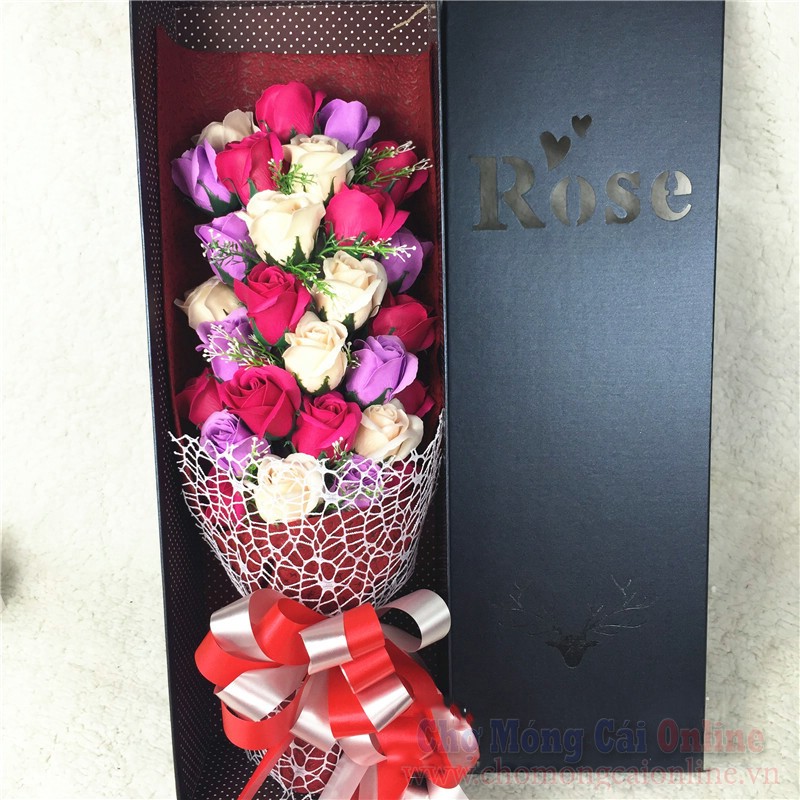 Hoa hồng sáp HQ025 gồm 33 bông hồng màu hồng nhung, trắng, tím được kết hợp sang trọng, mềm mại giống y hoa thật. 33 bông hồng với ý nghĩa thay lời thổ lộ "tôi yêu em - một tình yêu sâu sắc". Với thiết kế đơn giản, đẹp cuốn hút trên từng cánh hoa, tất cả được bó trang trí với phụ kiện giấy gói xinh xắn và đặt trong hộp quà thắt nơ lụa, thích hợp làm quà tặng, quà lưu niệm.