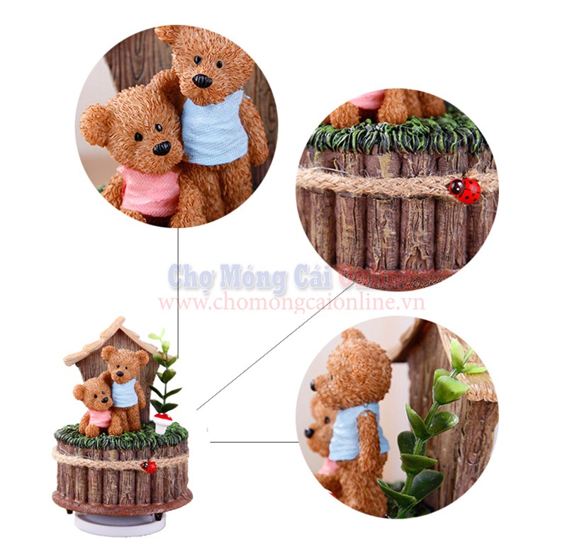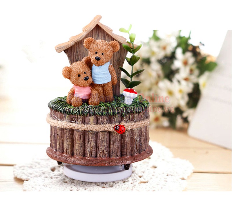 Hộp xoay phát nhạc được làm từ chất liệu nhựa cứng cao cấp, các vật liệu sơn phủ trang trí, phụ kiện đi kèm đều nằm trong nhóm vật liệu không độc hại, thân thiện với môi trường. Sản phẩm được phủ sơn và vẽ trang trí cực tỉ mỉ trên từng chi tiết nhỏ. Thiết kế xinh xắn, dễ thương ngộ nghĩnh với nhân vật là hai chú gấu nâu đáng yêu!